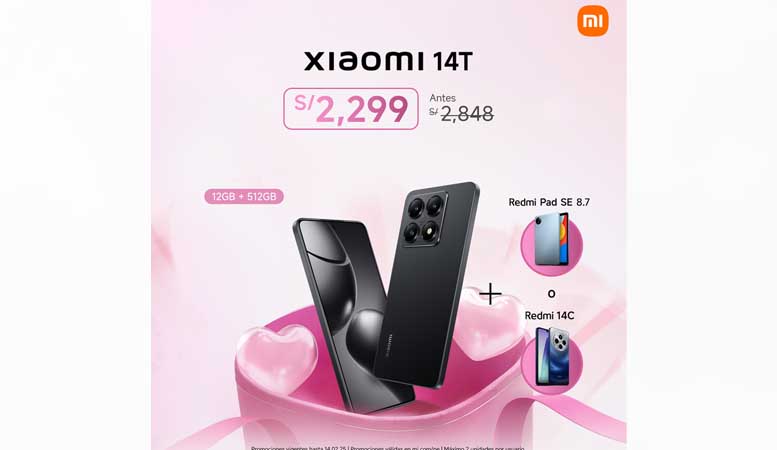 Por la compra del Xiaomi 14T, podrás llevarte la Redmi Pad SE 8.7, una tablet compacta con una batería de larga duración, o un Redmi 14C, un smartphone con procesador eficiente y cámara de alta resolución. Haz un regalo especial por solo S/2,299, antes a S/2,848.»