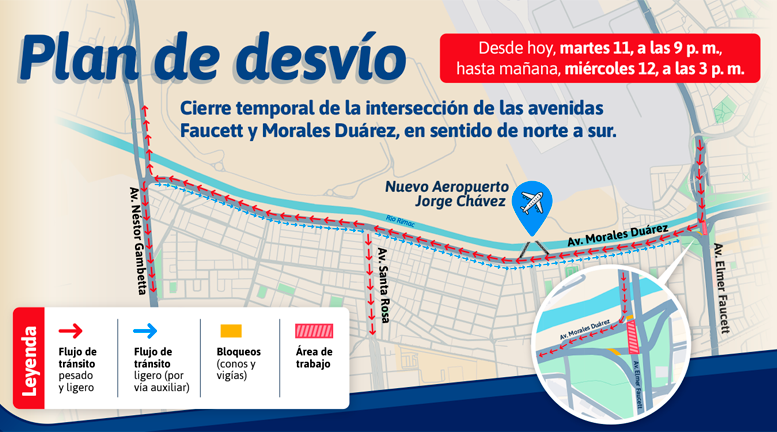 Para garantizar la correcta ejecución de las obras, se ha programado un cierre parcial y temporal del tránsito en la av. Faucett (intersección con Morales Duárez), en el tramo que va en sentido norte-sur, es decir, desde el aeropuerto hacia la avenida Morales Duárez. La restricción iniciará a las 9:00 p. m. de hoy y se extenderá hasta las 3:00 p.m. del miércoles 12 de marzo.