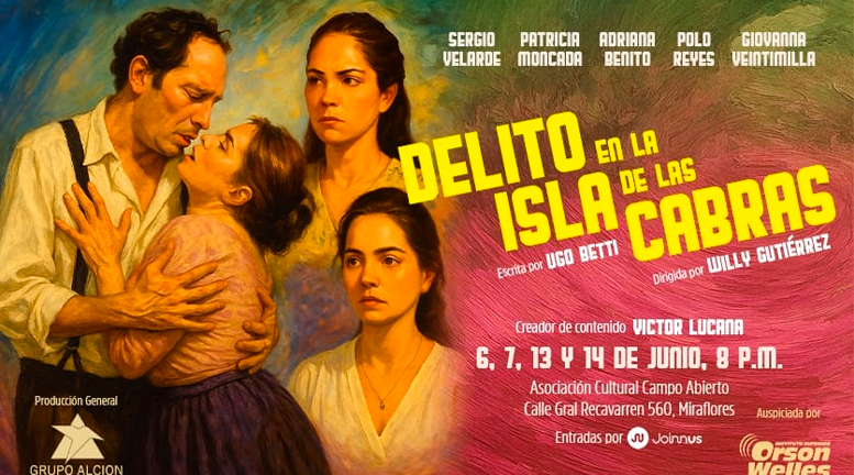 ALCION TEATRO presentará desde el viernes 6 de junio la obra de teatro “DELITO EN LA ISLA DE LAS CABRAS” de Ugo Betti, dirigida por el experimentado Willy Gutiérrez, que contará con las actuaciones de Giovanna Veintimilla, Patricia Moncada, Adriana Benito, Sergio Velarde y Polo Reyes. La temporada va del 6 al 14 de junio, viernes y sábados a las 8:00 p. m., en la Asociación Cultural Campo Abierto (Calle Recavarren 560, Miraflores). Las entradas están a la venta en Joinnus o en el siguiente enlace: https://wa.link/gr69ps.