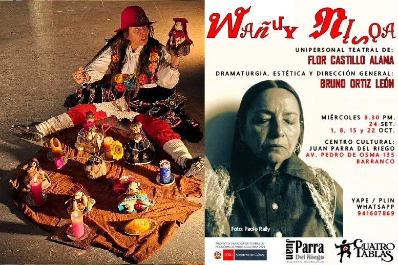 La Asociación para la Investigación Actoral CUATROTABLAS, en el marco de su 54 aniversario y con el apoyo de la Dirección General de Industrias Culturales y Artes del Ministerio de Cultura, presentará el unipersonal “Wañuy Nisqa: Muerte de ovarios / Muerte de origen / Muerte de vientre”, interpretado por la primera actriz nacional Flor Castillo. La obra cuenta con la dirección, dramaturgia y estética de Bruno Ortiz León.