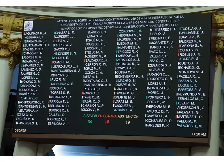 El Pleno del Congreso no aprobó el proyecto de resolución legislativa que proponía la inhabilitación por 10 años para el ejercicio de la función pública del exministro de Vivienda, Construcción y Saneamiento, Geiner Alvarado López. Por lo tanto, pasó al archivo.
