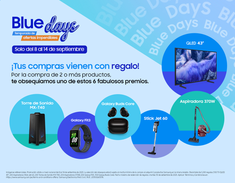 Samsung Perú invita a todos los amantes de la tecnología a aprovechar los Blue Days, una oportunidad única hasta el 14 de septiembre para renovar y complementar sus dispositivos con la mejor tecnología del mercado y recibir exclusivos regalos por su compra.