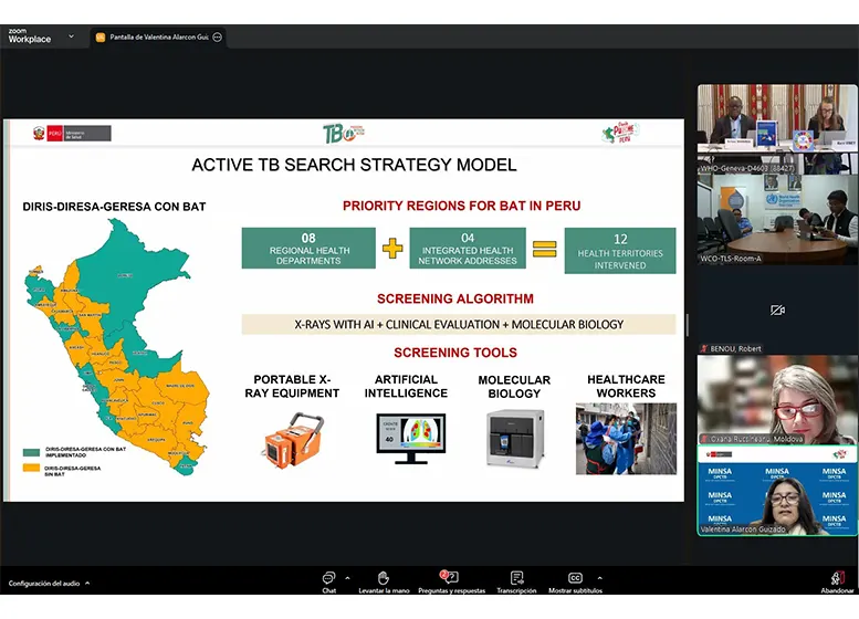 La directora ejecutiva de la Dirección de Prevención y Control de Tuberculosis del Ministerio de Salud, Valentina Alarcón, participó como ponente y presentó la experiencia peruana en la búsqueda activa de casos de TB en poblaciones vulnerables. En su intervención, resaltó que el Perú ha consolidado intervenciones en espacios comunitarios, albergues, centros penitenciarios y establecimientos de salud, con el fin de acercar la atención a quienes más lo necesitan.