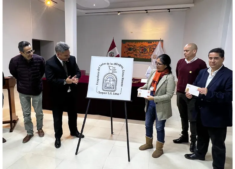El matasello conmemorativo reproduce la imagen del escapulario del Señor de los Milagros, símbolo de fe, protección y devoción que acompaña a millones de fieles dentro y fuera del Perú.