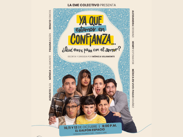 La Eme Colectivo teatral presentará la primera edición de Ya que estamos en confianza… ¿qué pasa con el amor?, una experiencia para disfrutar en 90 minutos tres historias cortas. Escrita y dirigida por Mónica Villamonte, inicia temporada el día viernes 10 de octubre a las 8:00 p.m. en El Galpón Espacio.