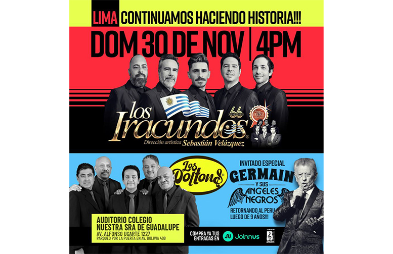 Usted no puede perderse “Una noche para recordar” celebrando los 60 años de Los Dolton’s junto a Los Iracundos y Germain de la Fuente y sus Ángeles Negros, que se realizará en Lima, el próximo domingo 30 de noviembre a las 4 de la tarde en el Auditorio Colegio Nuestra Sra. de Guadalupe (Av. Alfonso Ugarte 1227. Parqueo por la puerta en Av. Bolivia 408). Entradas a la venta en Joinnus.com