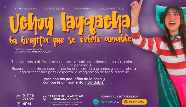 Este noviembre, el Teatro de la Amistad Peruano Chino se llena de color, música y tradición con el estreno de “Uchuy Layqacha: la brujita que se volvió amable”, una obra teatral que combina lo cultural, educativo, social y humano, invitando a niños y familias a redescubrir la magia de nuestras raíces.