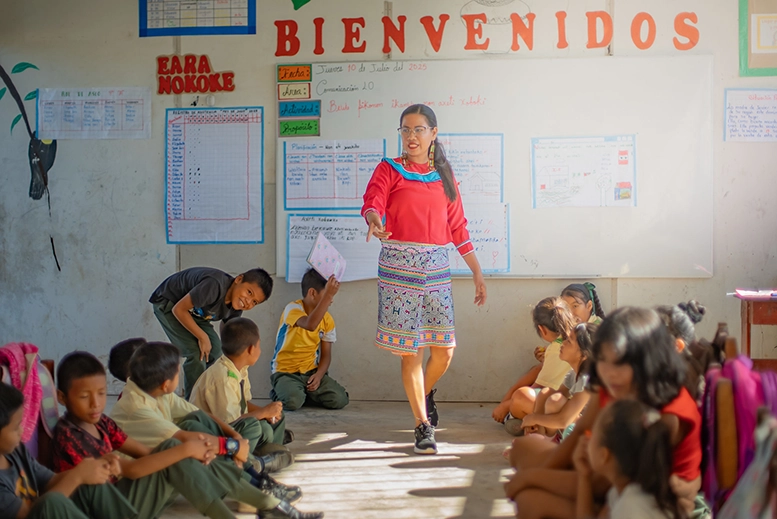 “Los niños no hablaban su lengua originaria por vergüenza. Solo se expresaban en castellano. Cuando les pedía que levantaran la mano quienes eran shipibos, algunos no lo hacían. Ahora hemos logrado que se reconozcan como shipibos y que manejan ambas lenguas, que realmente sean bilingües y orgullosos de su origen”, recalca la docente, quien en 2025 fue nombrada Coordinadora Pedagógica de Primaria de esta escuela intercultural.