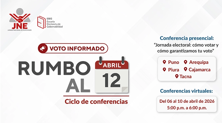 La Escuela Electoral y de Gobernabilidad del Jurado Nacional de Elecciones (JNE) presenta el ciclo de conferencias “Voto informado: rumbo al 12 de abril”, una iniciativa dirigida a la comunidad universitaria y ciudadanía con el objetivo de brindar información clara y accesible sobre las Elecciones Generales 2026 (EG 2026) y las garantías que protegen el voto.